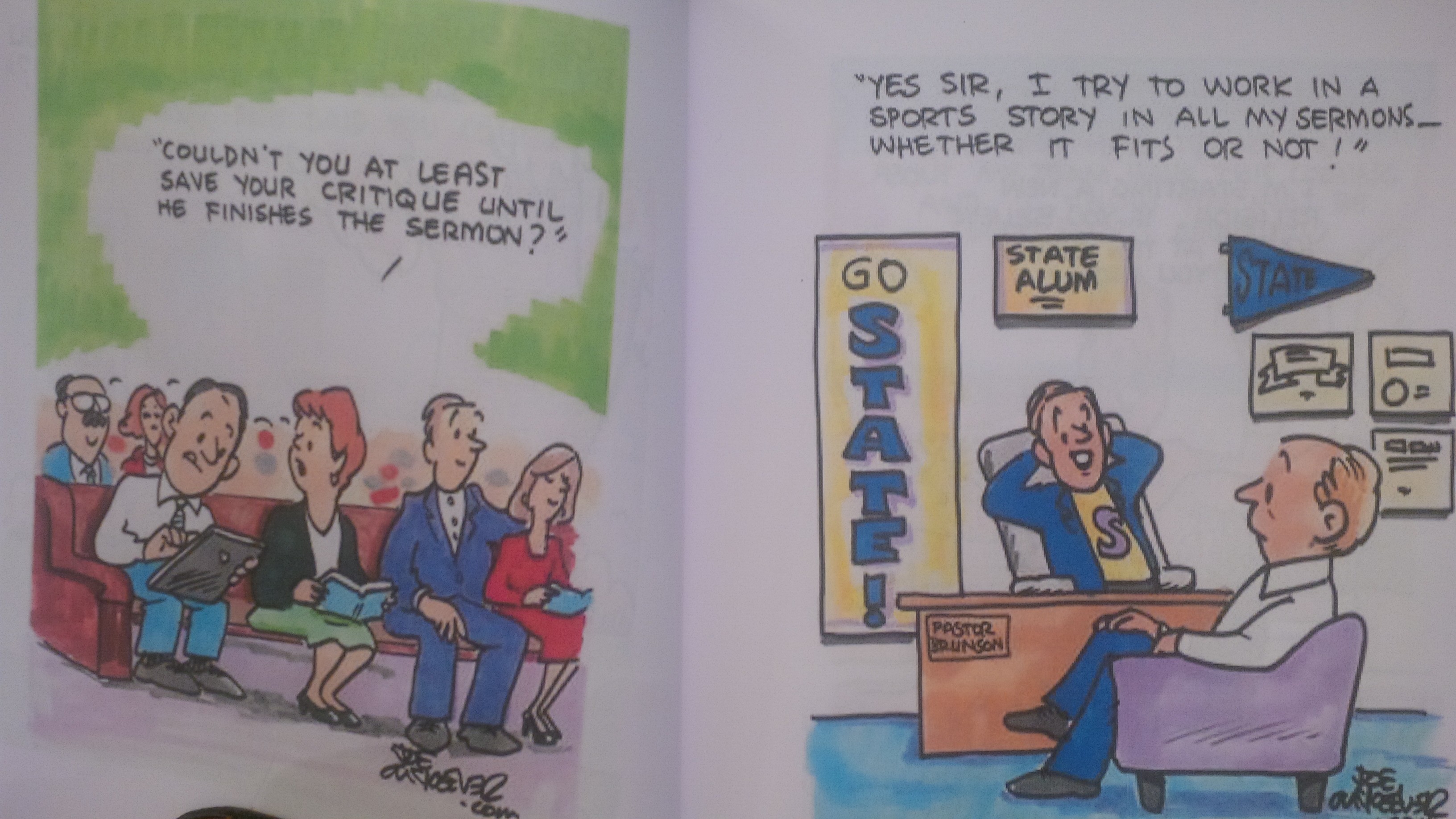 McKeever has a corny sense of humor, which I like. He pokes fun at pastors, deacons, pastor search committees, hypocrites in church, seeker-sensitive churches, Calvinism, fickle church members, Facebook, smart phones, politicians, TV, the lottery, sports, health and exercise, among other things. Some of the cartoons make a serious point, such as the one that shows a man in a wheelchair in front of a church with inaccessible steps, who says, “I’ll bet this is a real pretty church on the inside.”
